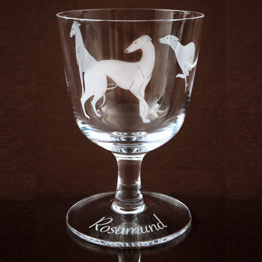 Clarissa stemmed glass Whippet with it’s pretty design of a whippet, standing running and sitting will be familiar to all Greyhound lovers. Exclusive to us, The Clarissa glass is a lovely shaped glass, homely and pleasing to the eye and hand and available with a wide selection of designs. There will be new designs in the future, but don’t worry we will continue to engrave the old favourites, simply adding subjects as there is demand. There is the option to have the foot of the glass personalised for that extra special present.